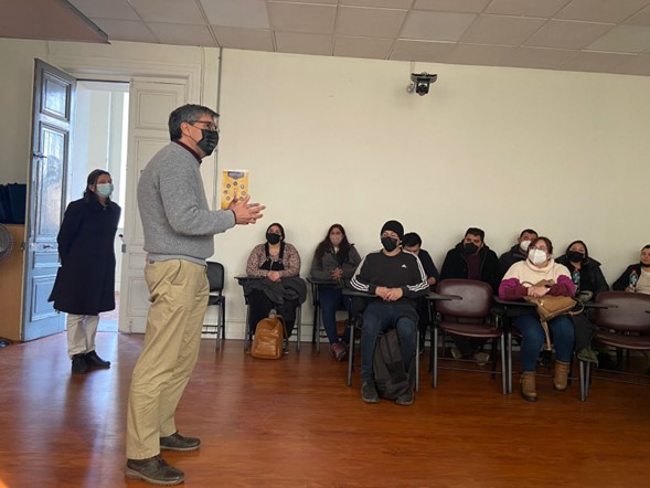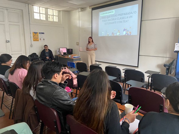 El docente del curso de diseño didáctico y evaluación en ciencia, Damián Ruiz, organizó una charla dictada por la tesista de la carrera de Pedagogía en Química y Biología, Alexsandra Aspee, con el objetivo de proporcionar herramientas para enfrentar inclusión en el aula, en específico con estudiantes con trastornos del espectro autista (TEA).