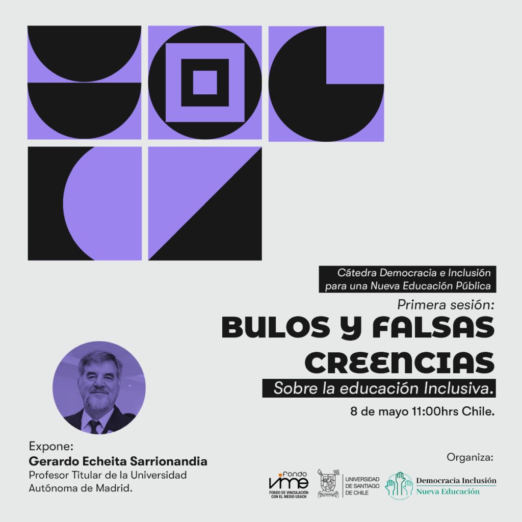 El próximo sábado 8 de mayo a las 11:00 horas se realizará la Primera sesión de la Cátedra Democracia e Inclusión para una Nueva Educación Pública, titulada “Bulos y falsas creencias sobre la educación inclusiva”, dictada por el expositor Gerardo Echeita Sarrionandia, Profesor Titular Universidad Autónoma de Madrid.