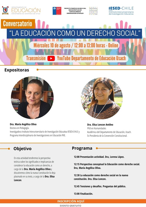 Departamento de Educación y Nodo Instituto Interuniversitario de Investigación Educativa invitan al Conversatorio Online “La Educación como un derecho social”