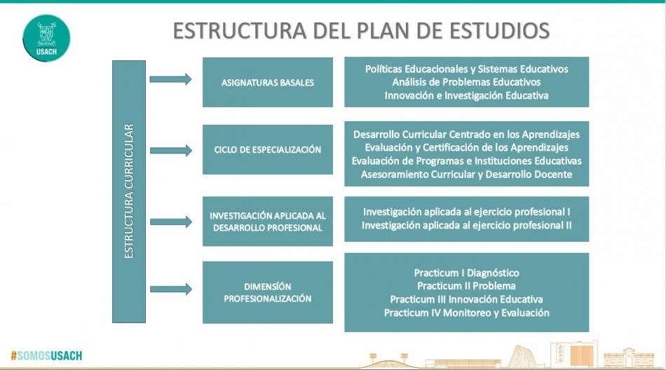 La arquitectura del plan de estudios comprende la formación en dos ciclos, uno de formación general durante el primer semestre, otro de formación especializada, durante los tres semestres siguientes. Transversalmente, durante los cuatro semestres se incorpora una dimensión de profesionalización, mediante las asignaturas “Practicum I Diagnóstico”, “Practicum II Problema”, “Practicum III Innovación Educativa” y “Practicum IV Monitoreo y Evaluación”.